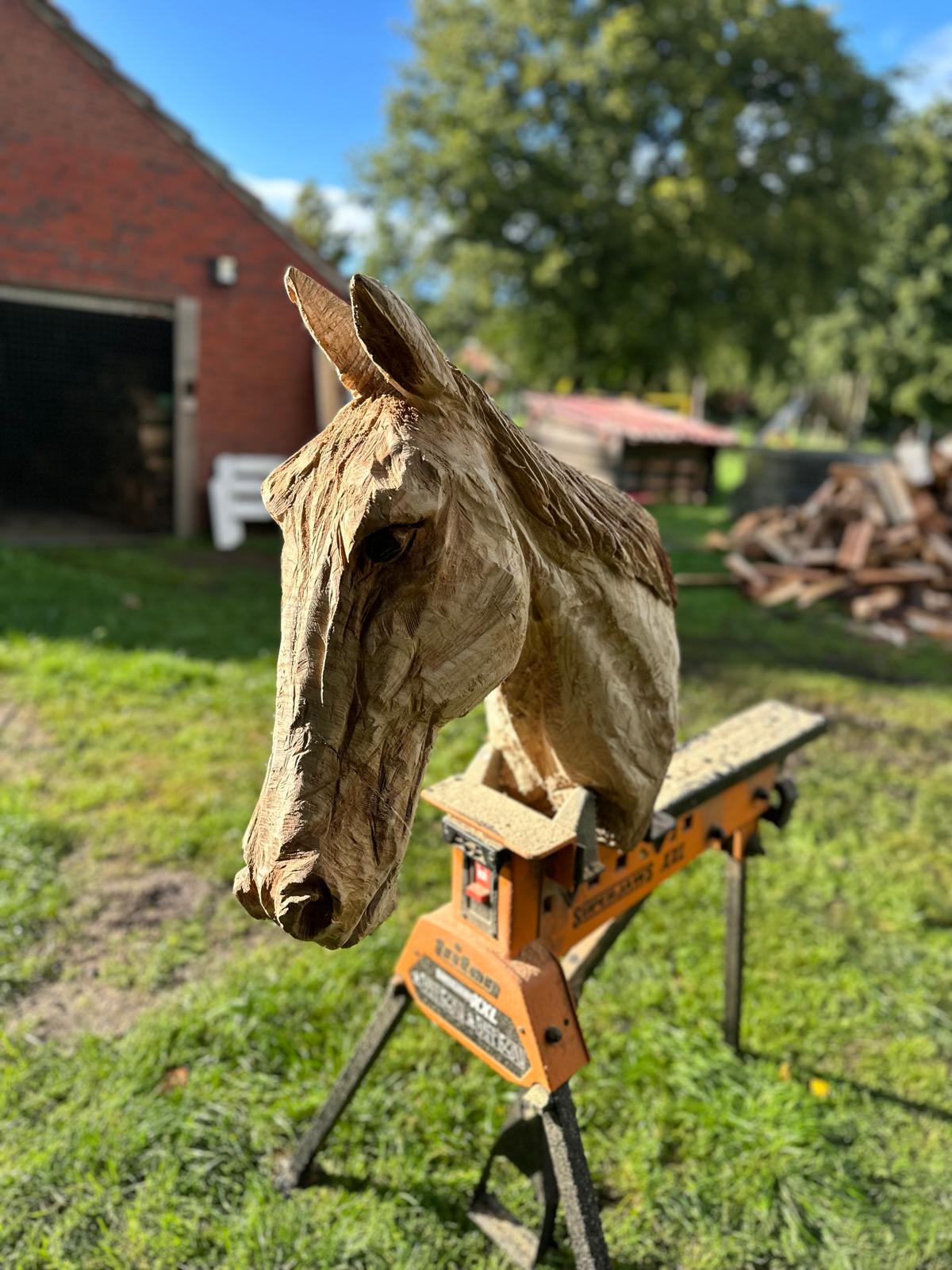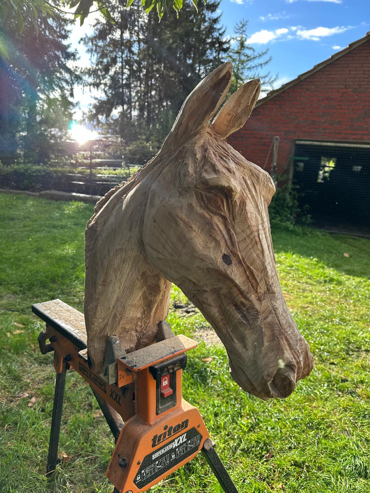 Neben einem Pferdekopf sind bei uns auch andere Skulpturen möglich, so auch ein lebensgroßes Pferd. Wir bieten dir eine einzigartige Pferdeskulptur an, die mit der Kettensäge geschnitzt wurde. Diese Skulptur ist nicht nur ein Blickfang, sondern auch ein Symbol für Kraft, Freiheit und Schönheit.