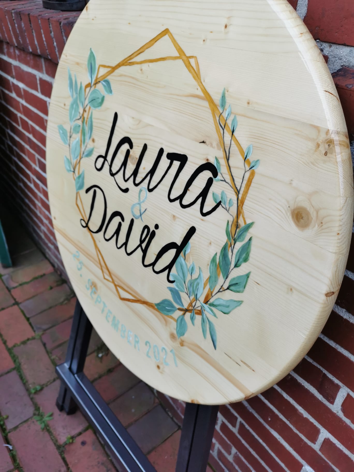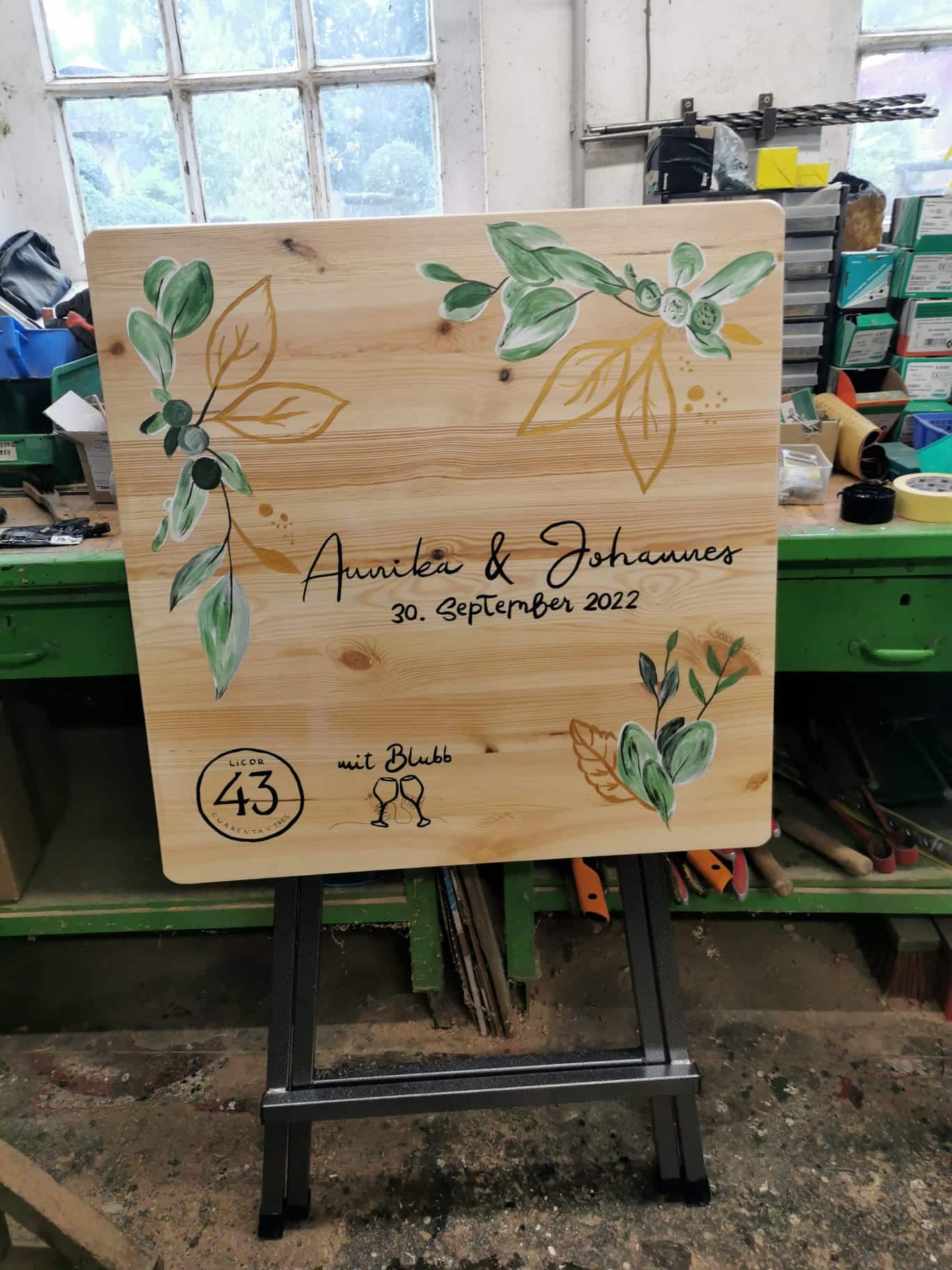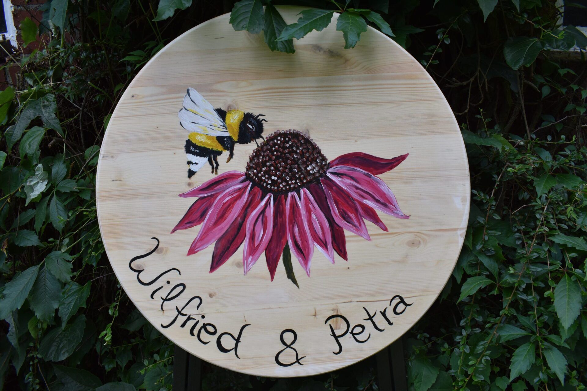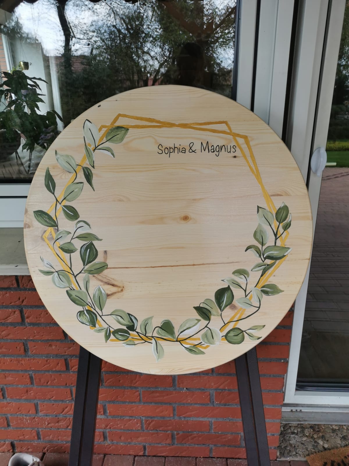 Dein Motiv wird handbemalt, nicht gelasert oder geschnitzt. Anschließend wird der Tisch klar lackiert, damit dein Design vor Kratzern, Feuchtigkeit und UV-Strahlung geschützt ist.